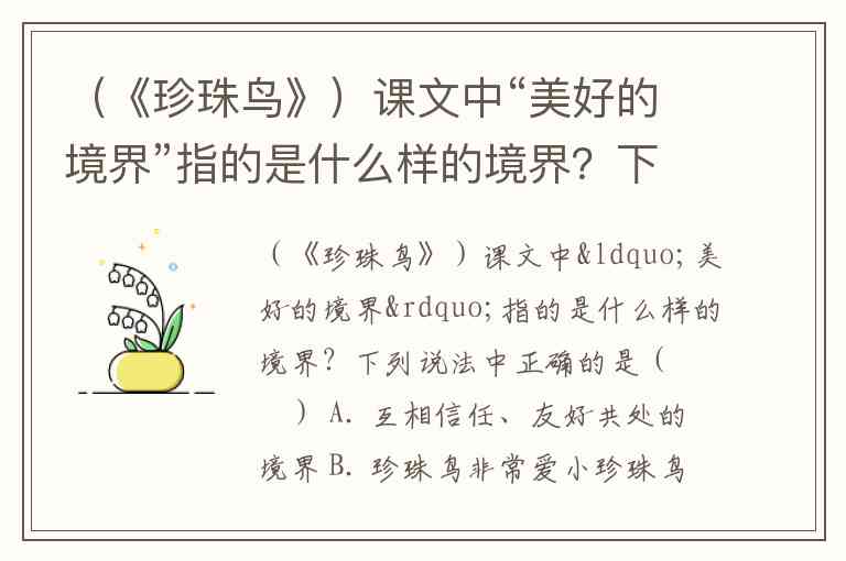 (《珍珠鸟》)课文中“美好的境界”指的是什么样的境界?下列说法中正确的是( ) A. 互相信任、友好共处的境界 B. 珍珠鸟非常爱小珍珠鸟的境界 C. 小珍珠鸟敢于在屋里飞来飞去的境界 D. 互相信任、友好共处的境界