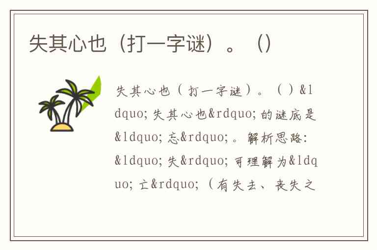 “失其心也”的谜底是“忘”。解析思路:“失”可理解为“亡”(有失去、丧失之意),“心”即汉字中的“心”部,“亡”与“心”组合便是“忘”字,恰合“失其心”(失去心、忘却)之意。