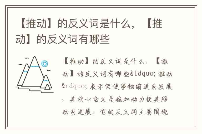 “推动”表示促使事物前进或发展,其核心含义是施加动力使其移动或进展。它的反义词主要围绕“阻止进展”“施加反向力量”或“使事物停滞”展开,具体使用需结合语境中“推动”的侧重点。