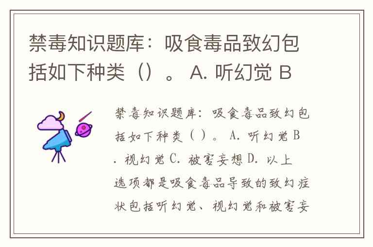 禁毒知识题库:吸食毒品致幻包括如下种类()。 A. 听幻觉 B. 视幻觉 C. 被害妄想 D. 以上选项都是