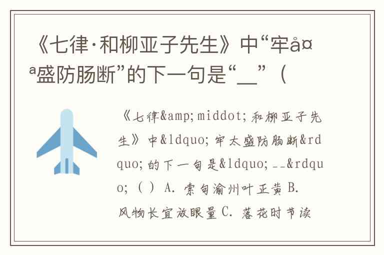 《七律·和柳亚子先生》中“牢太盛防肠断”的下一句是“__”() A. 索句渝州叶正黄 B. 风物长宜放眼量 C. 落花时节读华章 D. 观鱼胜过富春江