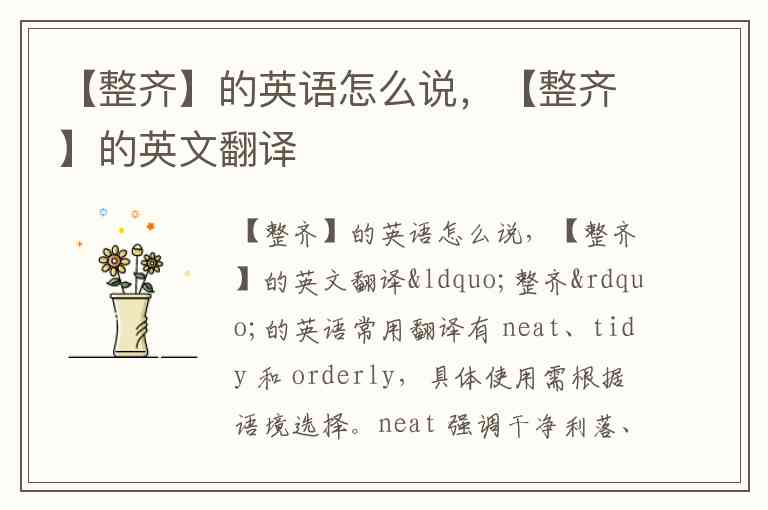 “整齐”的英语常用翻译有 neat、tidy 和 orderly,具体使用需根据语境选择。