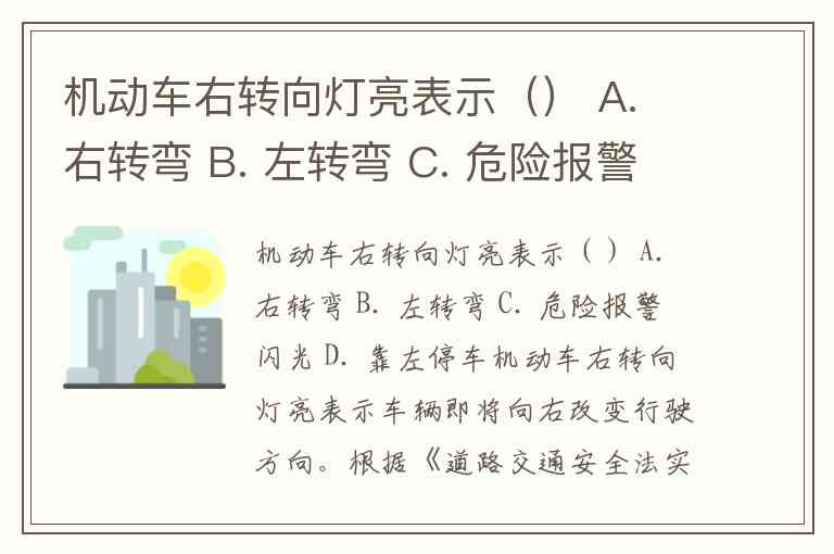 机动车右转向灯亮表示() A. 右转弯 B. 左转弯 C. 危险报警闪光 D. 靠左停车