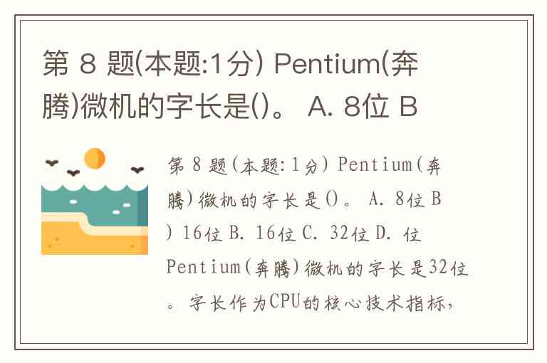 第 8 题(本题:1分) Pentium(奔腾)微机的字长是()。 A. 8位 B) 16位 B. 16位 C. 32位 D. 位