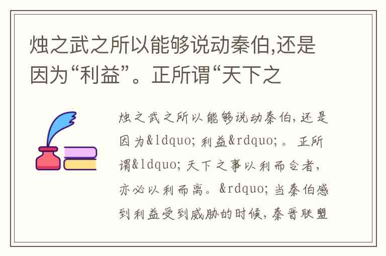 烛之武成功说服秦伯的核心逻辑正是“利益”驱动。在《烛之武退秦师》中,烛之武并未诉诸道德或情感,而是直击秦国的核心利益:他指出“越国以鄙远,君知其难也”,点明秦国难以从灭郑中获利;继而揭示“邻之厚,君之薄也”,阐明晋国吞并郑国后实力增强,反而会威胁秦国安全;最后以“许君焦、瑕,朝济而夕设版焉”的历史教训,证明晋国的不可信。