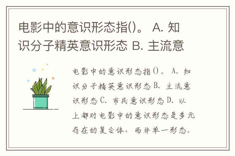 电影中的意识形态指()。 A. 知识分子精英意识形态 B. 主流意识形态 C. 市民意识形态 D. 以上都对