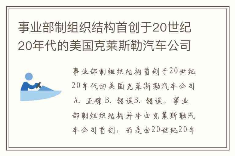 事业部制组织结构首创于20世纪20年代的美国克莱斯勒汽车公司 A. 正确 B. 错误