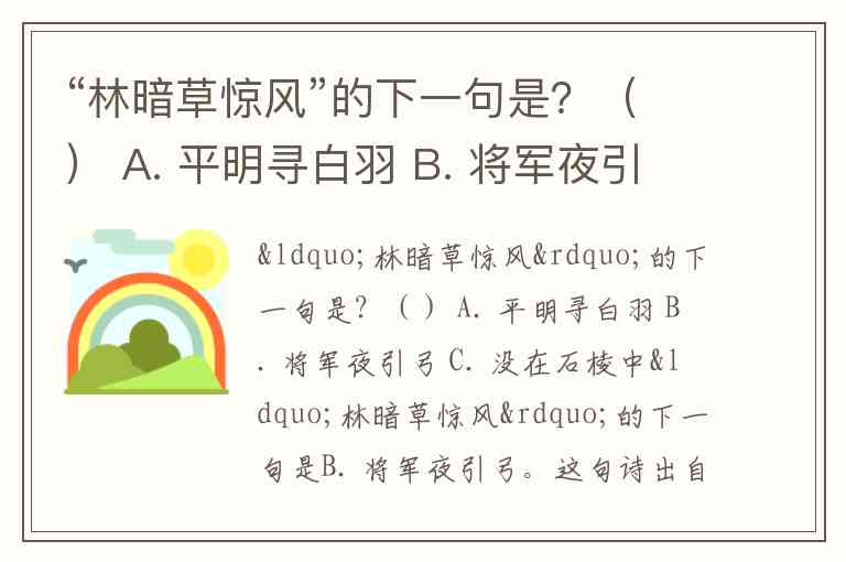 “林暗草惊风”的下一句是B. 将军夜引弓。这句诗出自唐代诗人卢纶的《和张仆射塞下曲·其二》,全诗通过“林暗草惊风,将军夜引弓。平明寻白羽,没在石棱中”四句,描绘了汉代名将李广夜间射虎的典故:昏暗的树林中风吹草动,将军误以为是猛虎,拉弓射箭;天明后寻找箭羽,发现箭头竟深深嵌入石缝之中,展现了将军非凡的臂力与镇定。