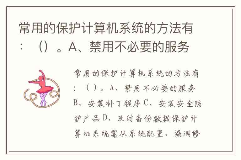 常用的保护计算机系统的方法有:()。A、禁用不必要的服务 B、安装补丁程序 C、安装安全防护产品 D、及时备份数据