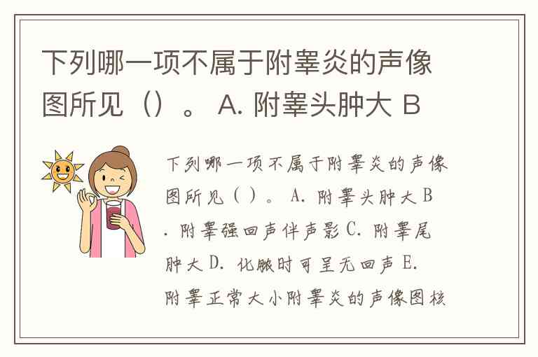 下列哪一项不属于附睾炎的声像图所见()。 A. 附睾头肿大 B. 附睾强回声伴声影 C. 附睾尾肿大 D. 化脓时可呈无回声 E. 附睾正常大小