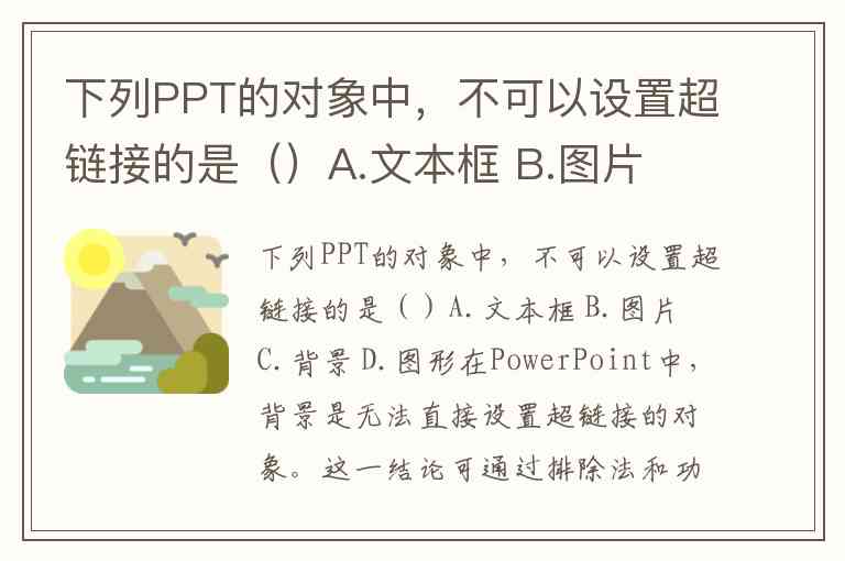 需要注意的是,虽然动态元素如动画效果或图表数据点也无法直接设置超链接,但题目选项中并未包含此类内容。而选项B(图片)在多个参考资料中均被明确列为可链接对象,因此正确答案只能是C.背景。这一结论也符合PowerPoint的设计逻辑——超链接需要绑定到具体的交互元素,而非幻灯片的基础样式层。