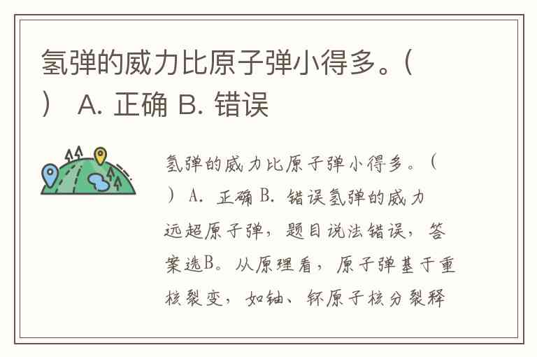 总之,原子弹只是氢弹聚变反应的“引信”,氢弹威力是原子弹的成百上千倍,题目中“氢弹的威力比原子弹小得多”的说法与事实完全相反。我们应正确认识核武器威力,警惕其对人类的巨大威胁。