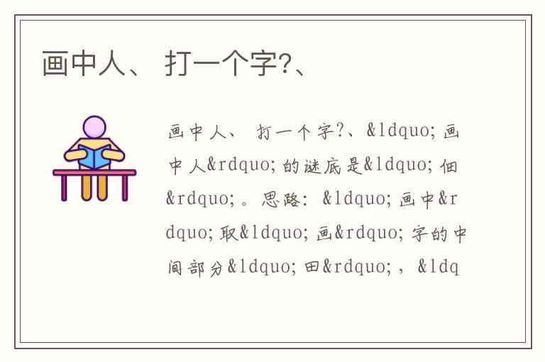 “画中人”的谜底是“佃”。思路:“画中”取“画”字的中间部分“田”,“人”对应单人旁“亻”,二者组合为“佃”。