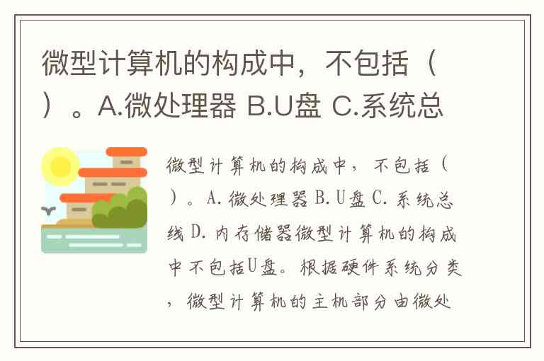 微型计算机的构成中,不包括()。A.微处理器 B.U盘 C.系统总线 D.内存储器