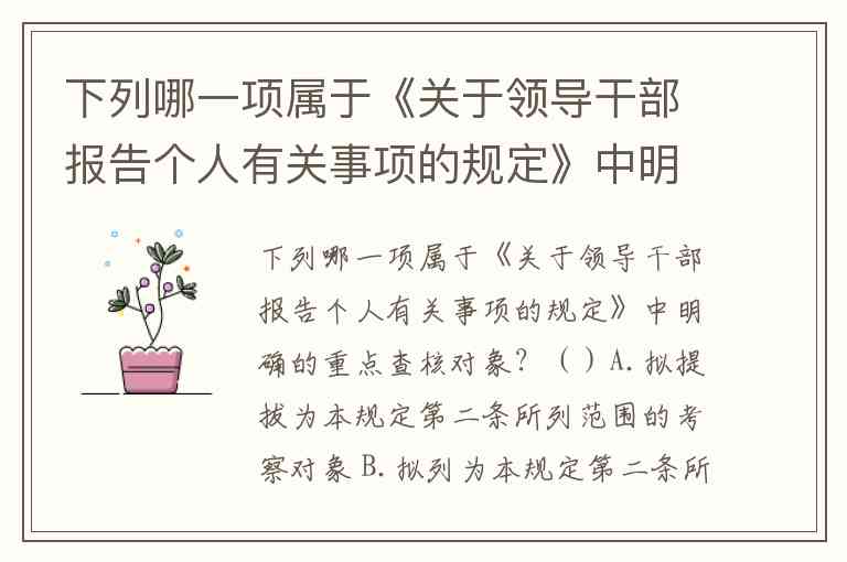下列哪一项属于《关于领导干部报告个人有关事项的规定》中明确的重点查核对象?()A.拟提拔为本规定第二条所列范围的考察对象 B.拟列为本规定第二条所列范围的后备干部人选 C.拟进一步使用的人选 D.因涉及个人报告事项的举报需要查核的 E.其他需要查核的