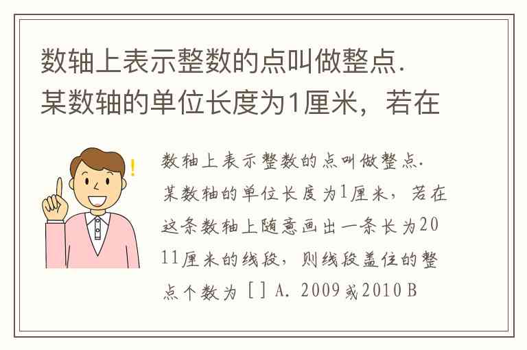 数轴上表示整数的点叫做整点.某数轴的单位长度为1厘米,若在这条数轴上随意画出一条长为2011厘米的线段,则线段盖住的整点个数为 [ ] A. 2009或2010 B. 2010或2011 C. 2011或2012 D. 2012或2013
