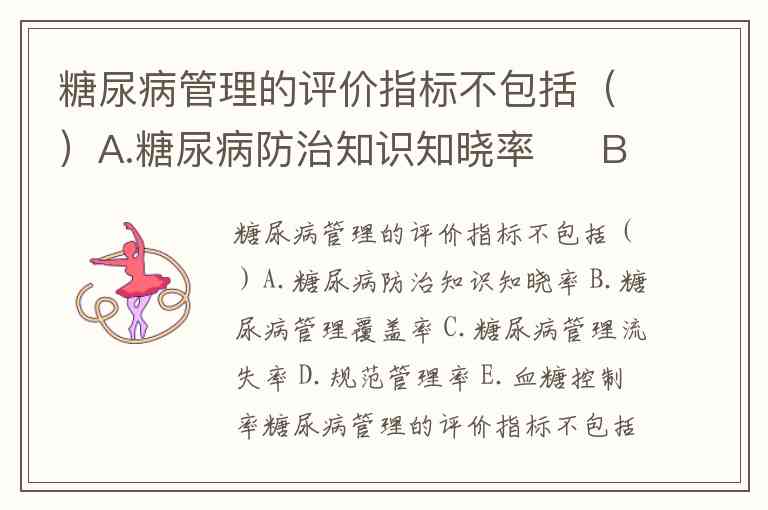 糖尿病管理的评价指标不包括()A.糖尿病防治知识知晓率 B.糖尿病管理覆盖率 C.糖尿病管理流失率 D.规范管理率 E.血糖控制率
