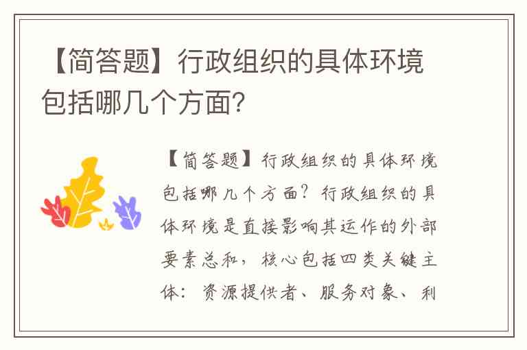 行政组织的具体环境是直接影响其运作的外部要素总和,核心包括四类关键主体:资源提供者、服务对象、利益群体和政府组织。这些要素通过资源供给、需求反馈、压力传导和政策调控等方式,直接塑造行政组织的决策与效能。