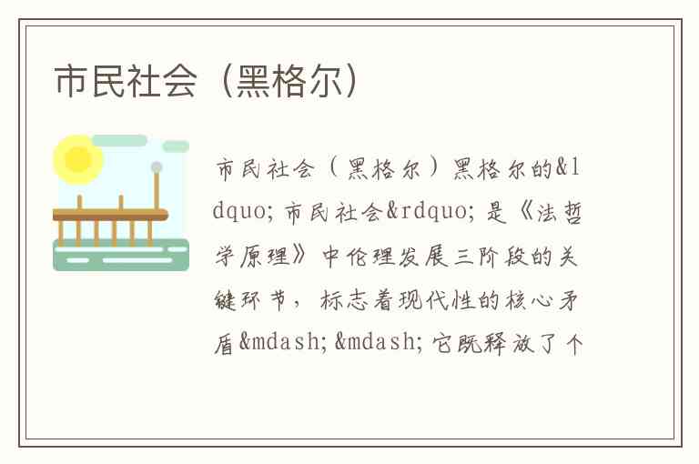 黑格尔的“市民社会”是《法哲学原理》中伦理发展三阶段的关键环节,标志着现代性的核心矛盾——它既释放了个体自由,又制造了社会分裂。这一概念首次系统出现在1821年的《法哲学原理》中,被定义为“各个成员作为独立单个人的联合”,是介于家庭(自然伦理)与国家(政治伦理)之间的“需要的体系”。在这里,每个人“以自身为目的”,通过劳动分工和商品交换满足私欲,却又不得不将他人视为实现利益的手段,形成“形式普遍性中的联合”。这种特殊性与普遍性的撕裂,正是黑格尔对资本主义市场经济的哲学诊断。