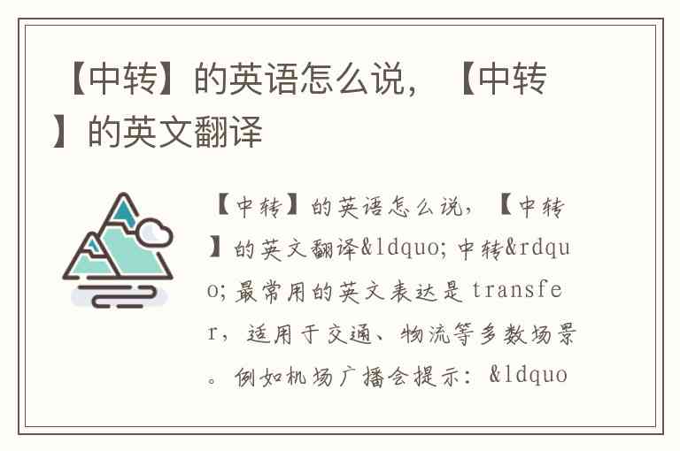 “中转”最常用的英文表达是 transfer,适用于交通、物流等多数场景。例如机场广播会提示:“Would all transfer passengers please report to the airport transfer desk”(凡需中转的旅客请到机场的中转服务台办理手续)。在航空语境中,“中转旅客”可表述为 transfer passengers,“中转处”则是 transfer correspondence。