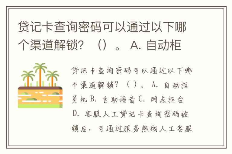 贷记卡查询密码可以通过以下哪个渠道解锁?()。 A. 自动柜员机 B. 自助语音 C. 网点柜台 D. 客服人工