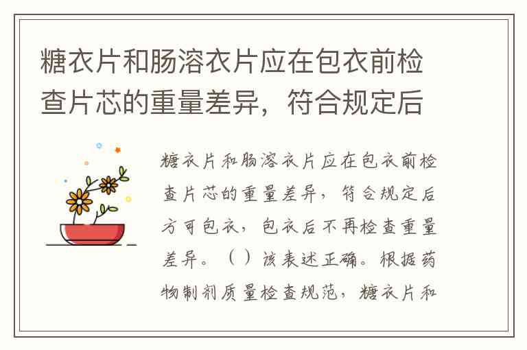 糖衣片和肠溶衣片应在包衣前检查片芯的重量差异,符合规定后方可包衣,包衣后不再检查重量差异。()