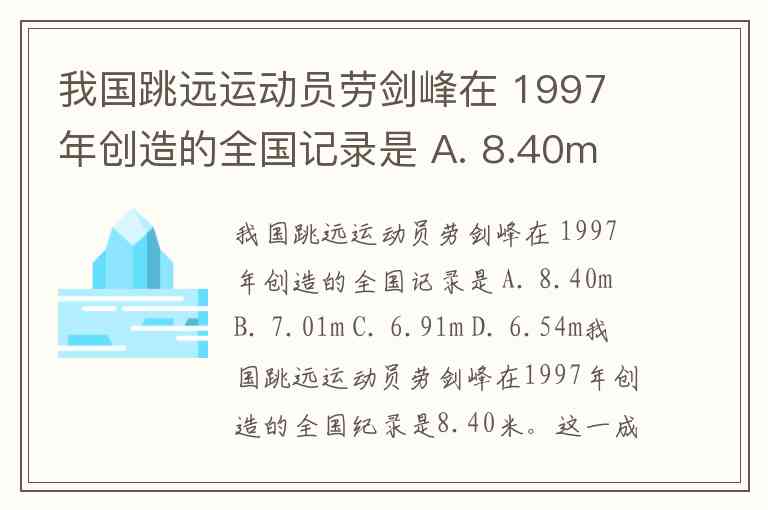 我国跳远运动员劳剑峰在 1997 年创造的全国记录是 A. 8.40m B. 7.01m C. 6.91m D. 6.54m