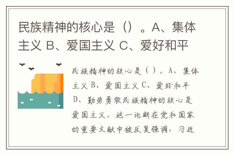 民族精神的核心是()。A、集体主义 B、爱国主义 C、爱好和平 D、勤劳勇敢