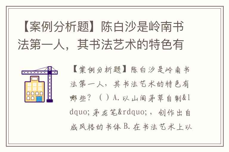 【案例分析题】陈白沙是岭南书法第一人,其书法艺术的特色有哪些?()A.以山间茅草自制“茅龙笔”,创作出自成风格的书体 B.在书法艺术上以碑入帖,自创有岭南特色的碑派书法 C.长于草书,又自成一家,书法挺拔遒劲,出神入化 D. “岭南四大书家”之一