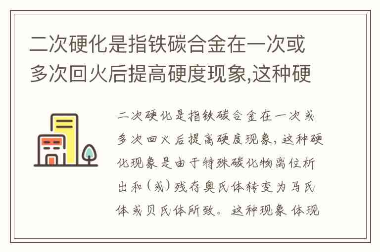 二次硬化是指铁碳合金在一次或多次回火后提高硬度现象,这种硬化现象是由于特殊碳化物离位析出和(或)残存奥氏体转变为马氏体或贝氏体所致。这种现象 体现尤为突出。 A. 碳钢 B. 铸铁 C. 不锈钢 D. 高速钢