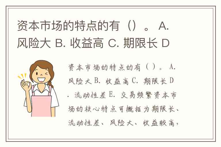 资本市场的特点的有()。 A. 风险大 B. 收益高 C. 期限长 D. 流动性差 E. 交易频繁