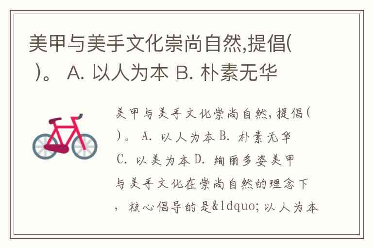美甲与美手文化崇尚自然,提倡( )。 A. 以人为本 B. 朴素无华 C. 以美为本 D. 绚丽多姿
