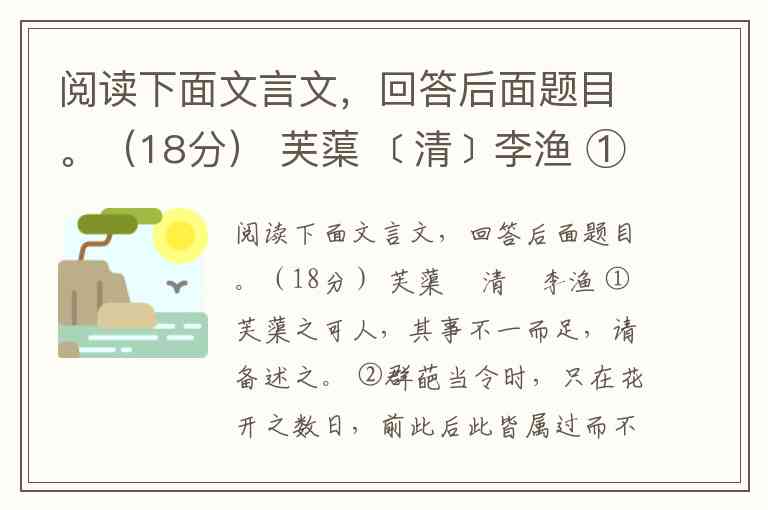 阅读下面文言文,回答后面题目。(18分) 芙蕖 ﹝清﹞李渔 ①芙蕖之可人,其事不一而足,请备述之。 ②群葩当令时,只在花开之数日,前此后此皆属过而不问之秋矣。芙蕖则不然。芙蕖自荷钱出水之日,便为点缀;及其茎叶既生,则又日高日上,日上日妍。有风既作飘摇之态,无风亦呈袅娜之姿,是我于花之未开,先享无穷逸致矣。迨至菡萏成花,娇姿欲滴,后先相继,自夏徂秋,此则在花为分内之事,在人为应得之资者也。及花之既谢,亦可告无罪于主人矣;乃复蒂下生蓬,蓬中结实,亭亭独立,犹似未开之花,与翠叶并擎,不至白露为霜而能事不已。此皆言其可目者也。 ③可鼻,则有荷叶之清香,荷花之异馥;避暑而暑为之退,纳凉而凉逐之生。 ④至其可人之口者, 则莲实与藕,皆并列盘餐而互芬齿颊者也。 ⑤只有霜中败叶,零落难堪,似成弃物矣;乃摘而藏之,又备经年裹物之用。 ⑥是芙蕖也者,无一时一刻不适耳目之观,无一物一丝不备家常之用者也。有五谷之实而不有其名,兼百花之长而各去其短,种植之利有大于此者乎? 小题1:请用斜线(∕)标出下面句子的朗读停顿。(共两处)(2分) 前此后此皆属过而不问之秋矣 小题2:解释下列句中加点词的意思。(4分) (1)请 备述之: (2)芙蕖则不 然: (3)及花之 既谢: (4)不至白露为霜而能事不 已: 小题3:请用现代汉语写出文中划线句子的意思。(4分) 则莲实与藕,皆并列盘餐而互芬齿颊者也。 小题4:文中第②段按照时间顺序说明,请仔细阅读, 摘录词句完成芙蕖的生长过程。(3分) 荷钱出水之日→ → →花之既谢→ 小题5:作者从哪些方面介绍芙蕖的?表现了它的什么特点?(5分)
