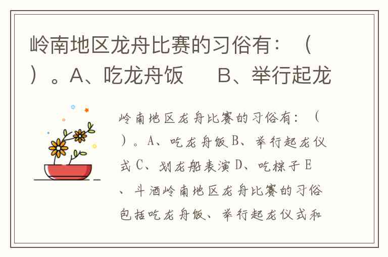 选项中,“吃粽子”虽为端午节传统,但更多与纪念屈原相关,并非岭南龙舟比赛特有的习俗;“斗酒”虽在龙舟饭中有饮酒环节,但“斗酒”并非正式习俗名称。因此正确答案为 A、B、C。这些习俗共同构成了岭南龙舟文化的完整仪式链,既保留了农耕文明对自然的敬畏,也彰显了水乡社会的凝聚力。