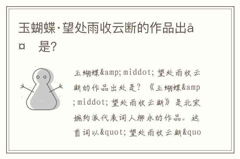 《玉蝴蝶·望处雨收云断》是北宋婉约派代表词人柳永的作品。这首词以"望处雨收云断"开篇,通过描绘秋景萧疏、蘋花老去、梧叶飘黄的凄凉景象,抒发对湘中故人的深切怀念。作为柳永慢词创作的典范,全词将写景、叙事、忆旧与怀人融为一体,以上阕"故人何在,烟水茫茫"的怅惘与下阕"断鸿声里,立尽斜阳"的孤寂形成呼应,展现出时空交错的艺术张力。