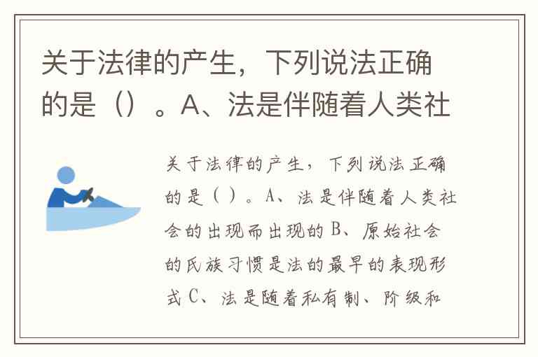 关于法律的产生,下列说法正确的是()。A、法是伴随着人类社会的出现而出现的 B、原始社会的氏族习惯是法的最早的表现形式 C、法是随着私有制、阶级和国家的产生而产生的 D、法律完全是阶级斗争的产物,而不是出于调整经济关系的需要