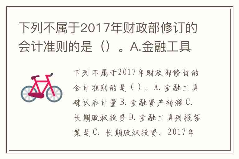 下列不属于2017年财政部修订的会计准则的是()。A.金融工具确认和计量 B.金融资产转移 C.长期股权投资 D.金融工具列报