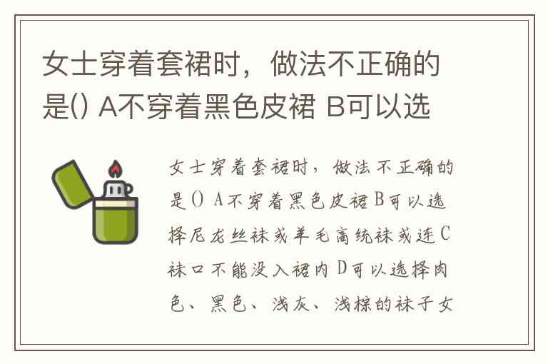 女士穿着套裙时,做法不正确的是() A不穿着黑色皮裙 B可以选择尼龙丝袜或羊毛高统袜或连 C袜口不能没入裙内 D可以选择肉色、黑色、浅灰、浅棕的袜子