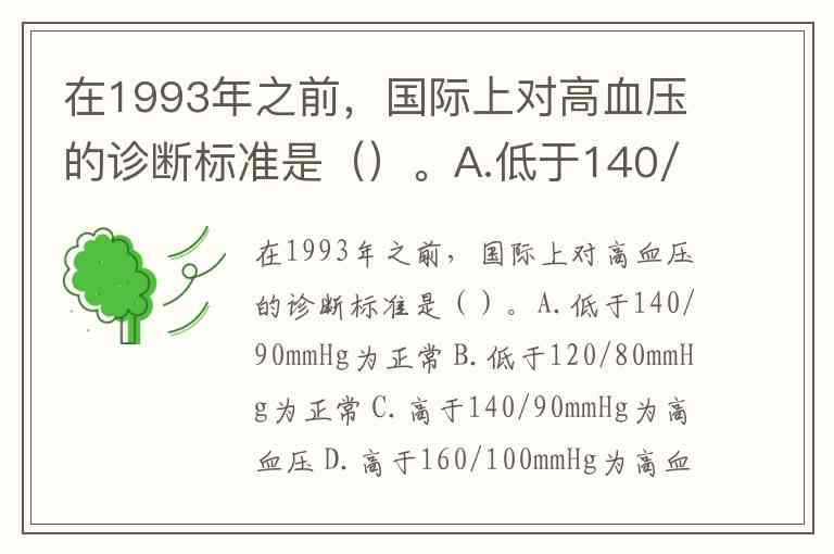 在1993年之前,国际上对高血压的诊断标准是()。A.低于140/90mmHg为正常 B.低于120/80mmHg为正常 C.高于140/90mmHg为高血压 D.高于160/100mmHg为高血压