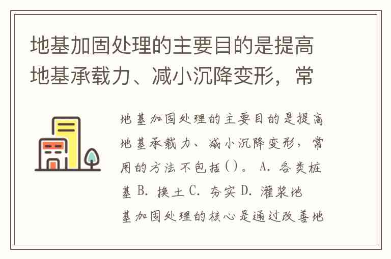 地基加固处理的主要目的是提高地基承载力、减小沉降变形,常用的方法不包括( )。 A. 各类桩基 B. 换土 C. 夯实 D. 灌浆