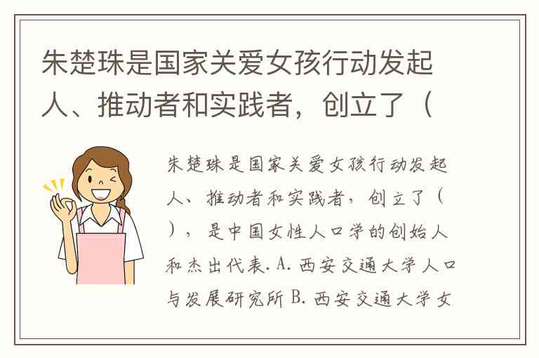 朱楚珠是国家关爱女孩行动发起人、推动者和实践者,创立了(),是中国女性人口学的创始人和杰出代表.A.西安交通大学人口与发展研究所 B.西安交通大学女性研究所 C.西安交通大学性别研究所 D.西安交通大学人口研究所