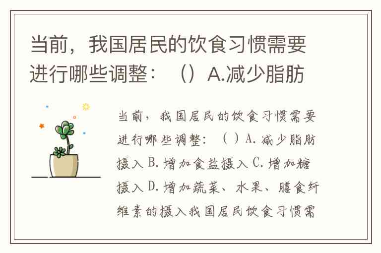 当前,我国居民的饮食习惯需要进行哪些调整:()A.减少脂肪摄入 B.增加食盐摄入 C.增加糖摄入 D.增加蔬菜、水果、膳食纤维素的摄入