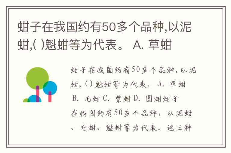 蚶子在我国约有50多个品种,以泥蚶,( )魁蚶等为代表。 A. 草蚶 B. 毛蚶 C. 紫蚶 D. 圆蚶