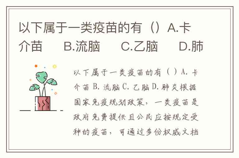 根据国家免疫规划政策,一类疫苗是政府免费提供且公民应按规定受种的疫苗,可通过多份权威文档确认以下选项分类:A.卡介苗、B.流脑、C.乙脑均属于一类疫苗,而D.肺炎疫苗为二类疫苗。