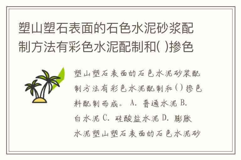 塑山塑石表面的石色水泥砂浆配制方法有彩色水泥配制和( )掺色料配制而成。 A. 普通水泥 B. 白水泥 C. 硅酸盐水泥 D. 膨胀水泥