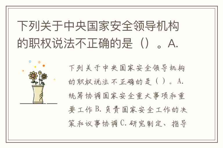 下列关于中央国家安全领导机构的职权说法不正确的是()。A.统筹协调国家安全重大事项和重要工作 B.负责国家安全工作的决策和议事协调 C.研究制定、指导实施国家安全战略和有关重大方针政策 D.统筹协调所有国家安全事项和工作