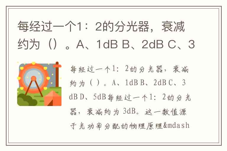 这一标准在通信工程中广泛应用,例如GPON网络中明确将1:2分光器的衰减定为3dB ,相关技术规范也将“3dB法”作为计算依据——即每增加一级1:2分光,衰减叠加3dB,如1:64分光器(含6级1:2分光)的衰减约为 。多个试题及技术文档均印证了这一结论,选项中3dB为唯一正确答案 。