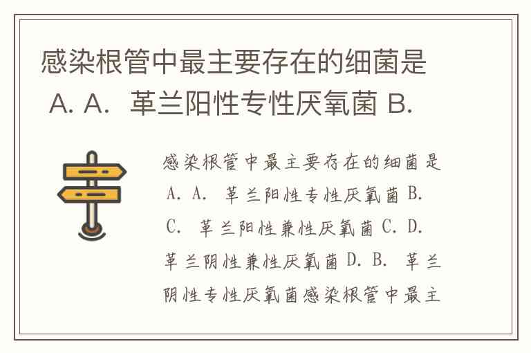 感染根管中最主要存在的细菌是 A. A.革兰阳性专性厌氧菌 B. C.革兰阳性兼性厌氧菌 C. D.革兰阴性兼性厌氧菌 D. B.革兰阴性专性厌氧菌