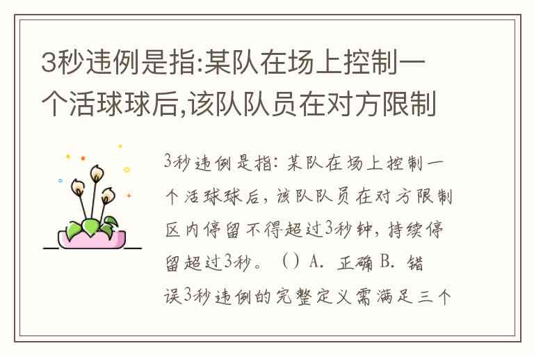 3秒违例的完整定义需满足三个核心条件:进攻队控制活球、比赛计时钟正在运行、进攻队员在对方限制区内持续停留超过3秒。题目描述中缺少“比赛计时钟正在运行”这一关键条件——例如掷界外球时,即便队员已控制活球,但计时钟未启动时在限制区停留不计入3秒。因此该陈述不准确。