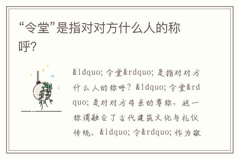 如今,“令堂”虽不再日常使用,但在传统礼仪场合仍具生命力。理解其背后的“北堂萱草”典故,不仅能避免“称对方父亲为令堂”这类常识错误,更能体会汉语称谓中深藏的人文温度——每个词都是一段文化记忆的浓缩。下次若需在正式场合提及他人母亲,一句“令堂”既能展现修养,也悄然延续了千年的礼仪文化。